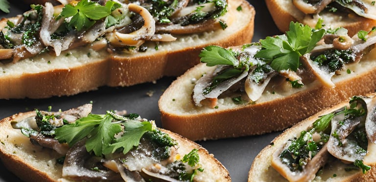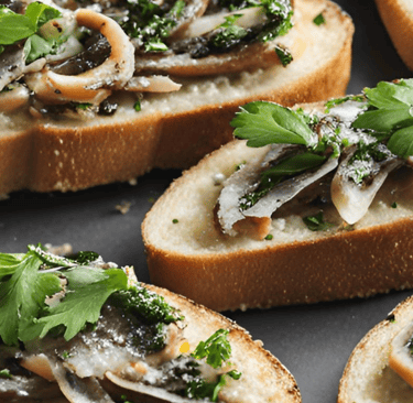 Garnissez chaque tranche de pain de deux filets d’anchois et de persil frais. N’hésitez pas à ajouter un peu de piment si vous aimez le piquant.